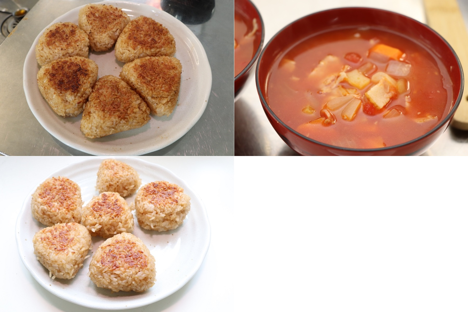 調理実習は1年生の家庭基礎、3年1組〜3組の総合演習3の授業で行われています。(広報担当の)授業等の関係で、すべてのクラスの様子を掲載できないことがありますので、ご了承ください。3枚目の写真は完成した焼きおにぎりとミネストローネの写真です。体が温まりそうな雰囲気を醸し出しています。